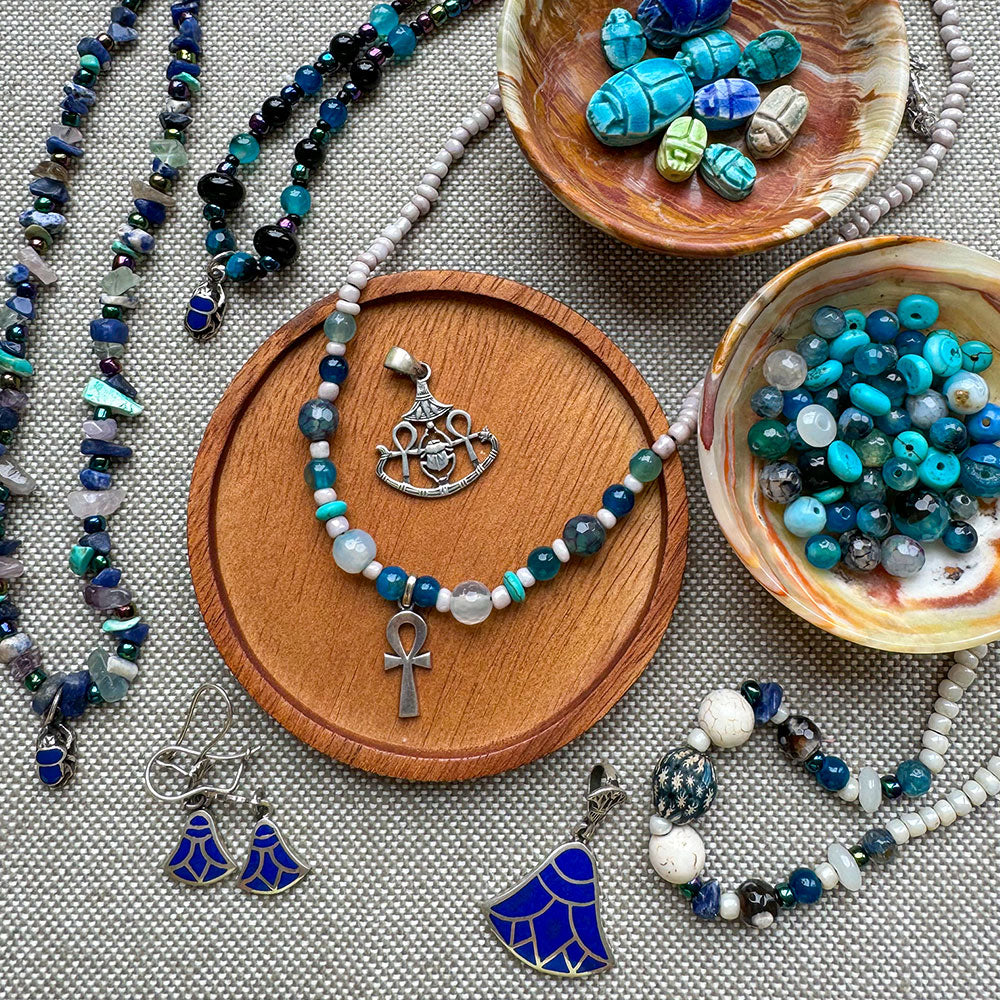 This Noot collection is inspired by the ancient Egyptian goddess herself. Each piece draws from ancient Egyptian symbols like Lotus, the key of life in celestial blues and sterling silver.