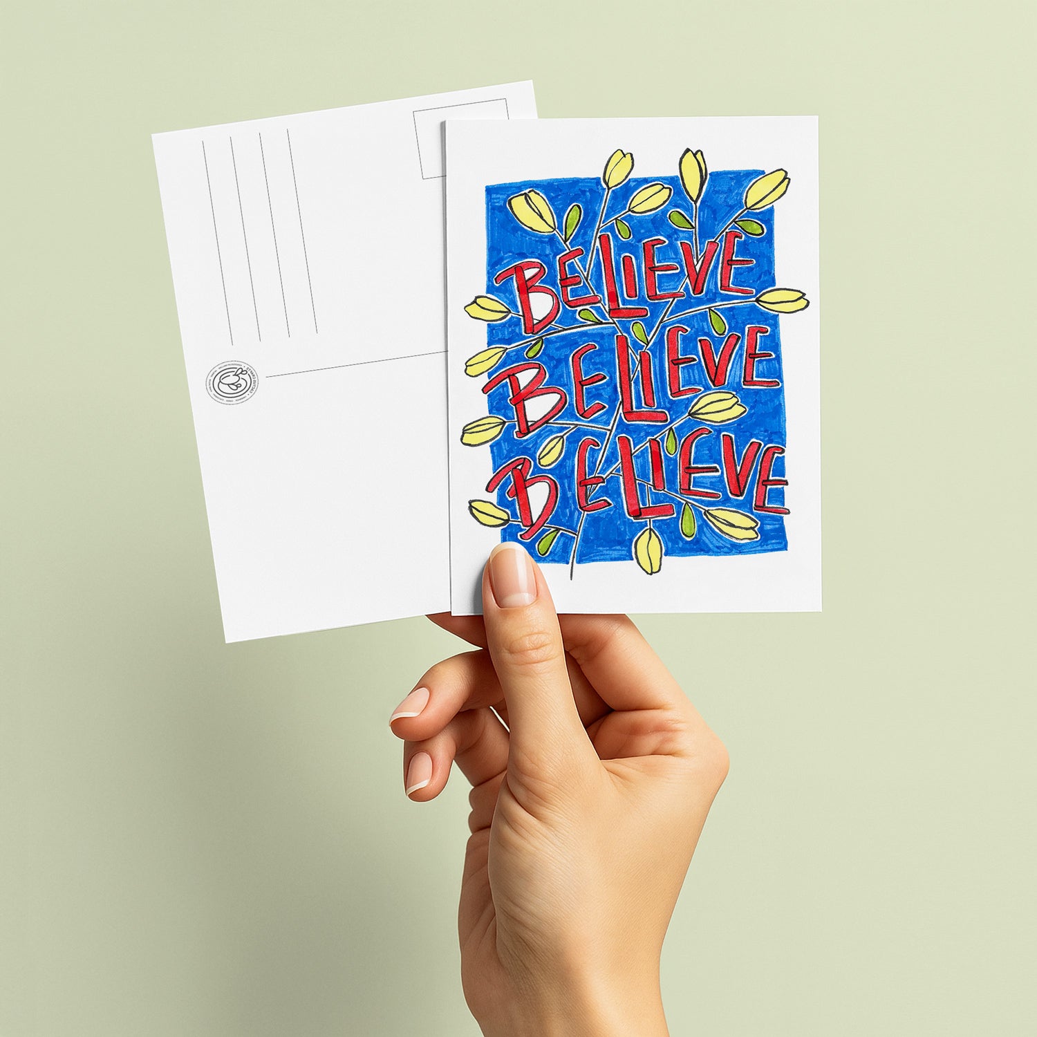 This A6 printed postcard is a gentle encouragement to hold onto belief— in yourself, your dreams, and the possibilities ahead. Featuring a serene design with blooming flower buds, it highlights the uplifting quote "Believe, believe, believe," inspiring confidence, hope, and inner strength.