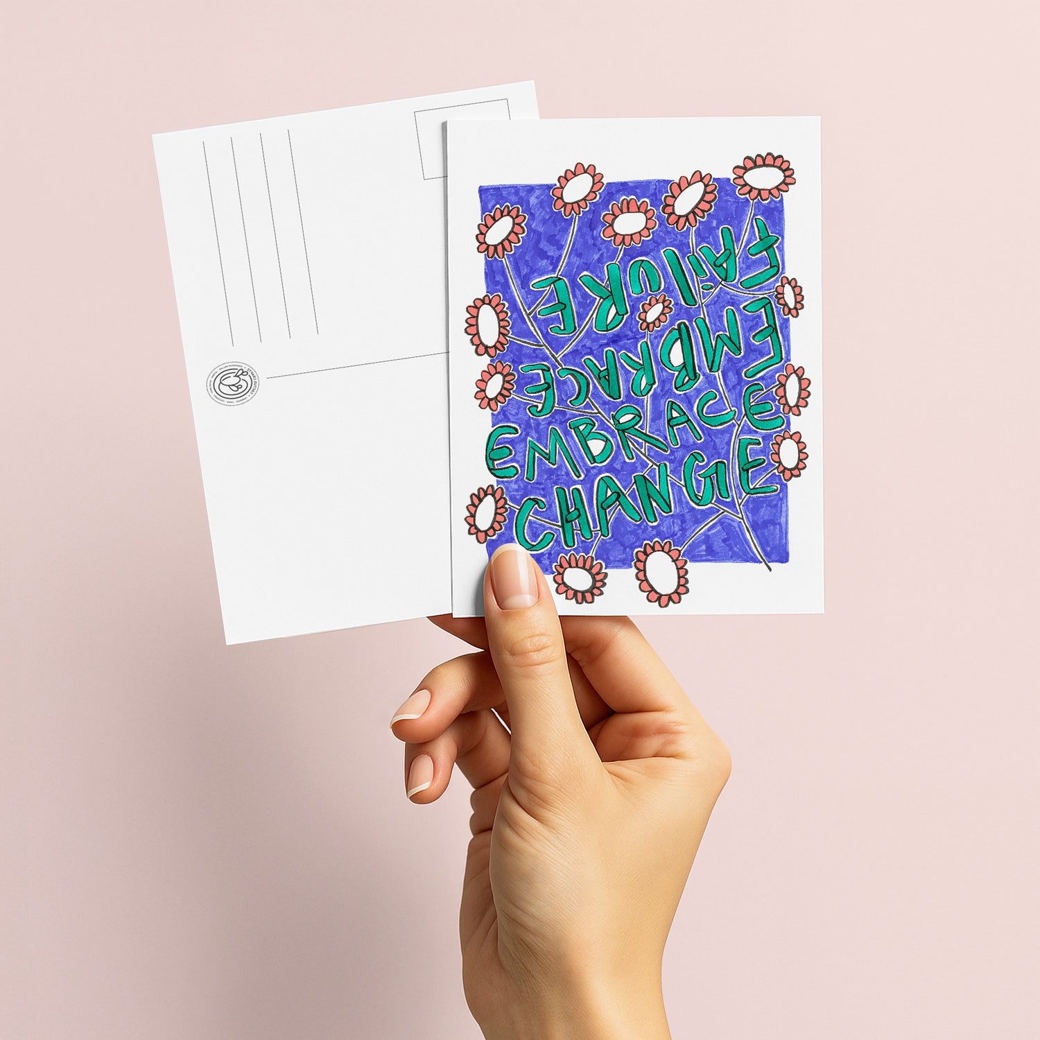 This A6 printed postcard is a powerful reminder to welcome growth in all its forms. Featuring a thoughtfully designed mirrored layout, it highlights the inspiring quote "Embrace failure, embrace change," encouraging resilience, adaptability, and self-discovery.