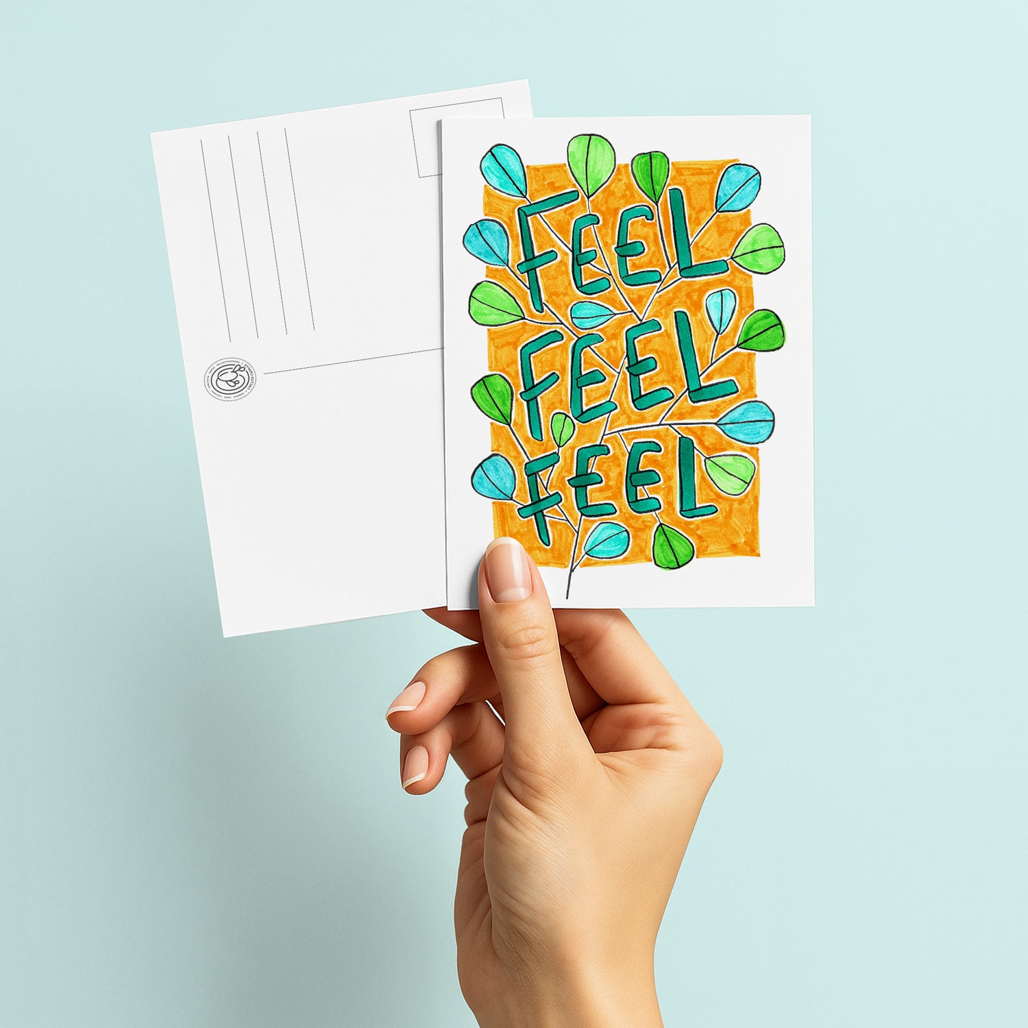 This A6 printed postcard is a gentle invitation to embrace your emotions. Featuring a soothing design with delicate leaves, it highlights the mindful quote "Feel, feel, feel," encouraging presence, self-awareness, and emotional connection.