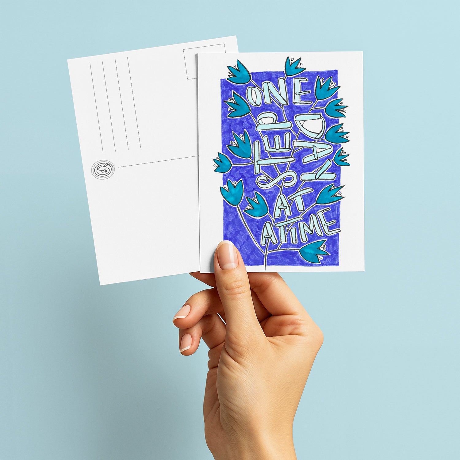 This A6 printed postcard is a gentle reminder to move forward with patience and grace. Featuring a unique mirrored design with the uplifting quote "One step at a time, one day at a time," it encourages perseverance, mindfulness, and steady progress.