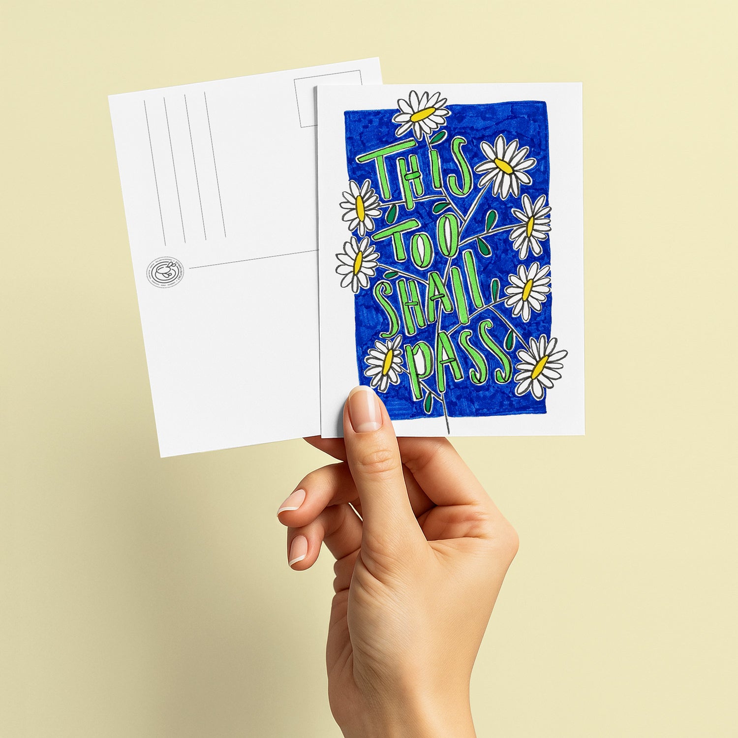 This A6 printed postcard is a gentle reminder that every moment, no matter how difficult, is temporary. Featuring a delicate design with soft daisy illustrations, it showcases the reassuring quote "This too shall pass," offering comfort, resilience, and hope.