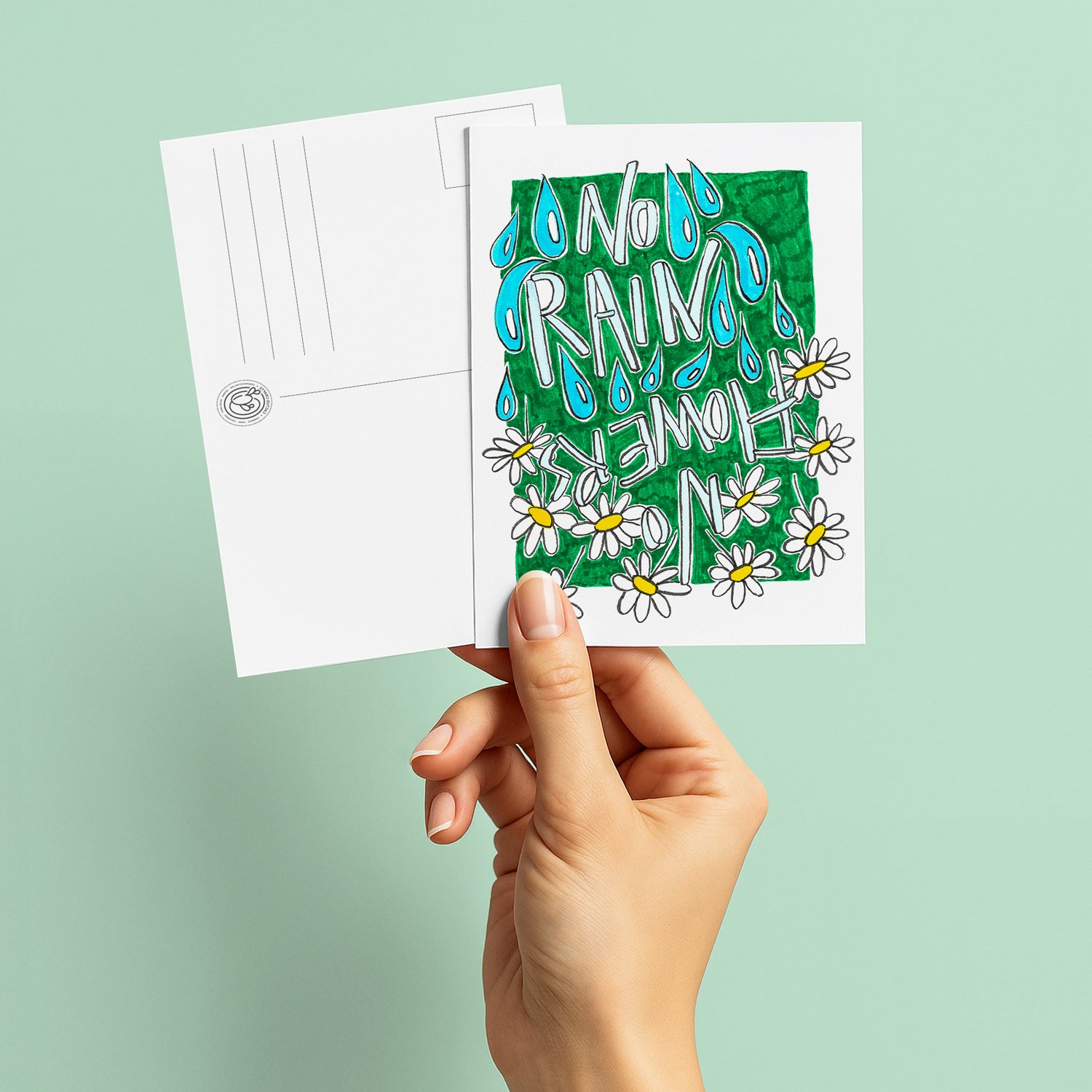This A6 printed postcard is a beautiful reminder that growth comes from life's challenges. Featuring a delicate design with soft floral illustrations, it showcases the inspiring quote "No Rain, No Flowers," symbolizing resilience, renewal, and the beauty that follows difficult times.