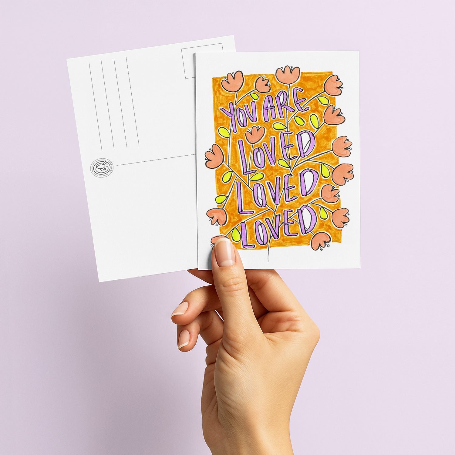 This A6 printed postcard is a heartfelt reminder that you are deeply loved. Featuring a delicate floral illustration alongside the reassuring quote "You are loved, loved, loved," it carries a message of warmth, care, and unconditional love.