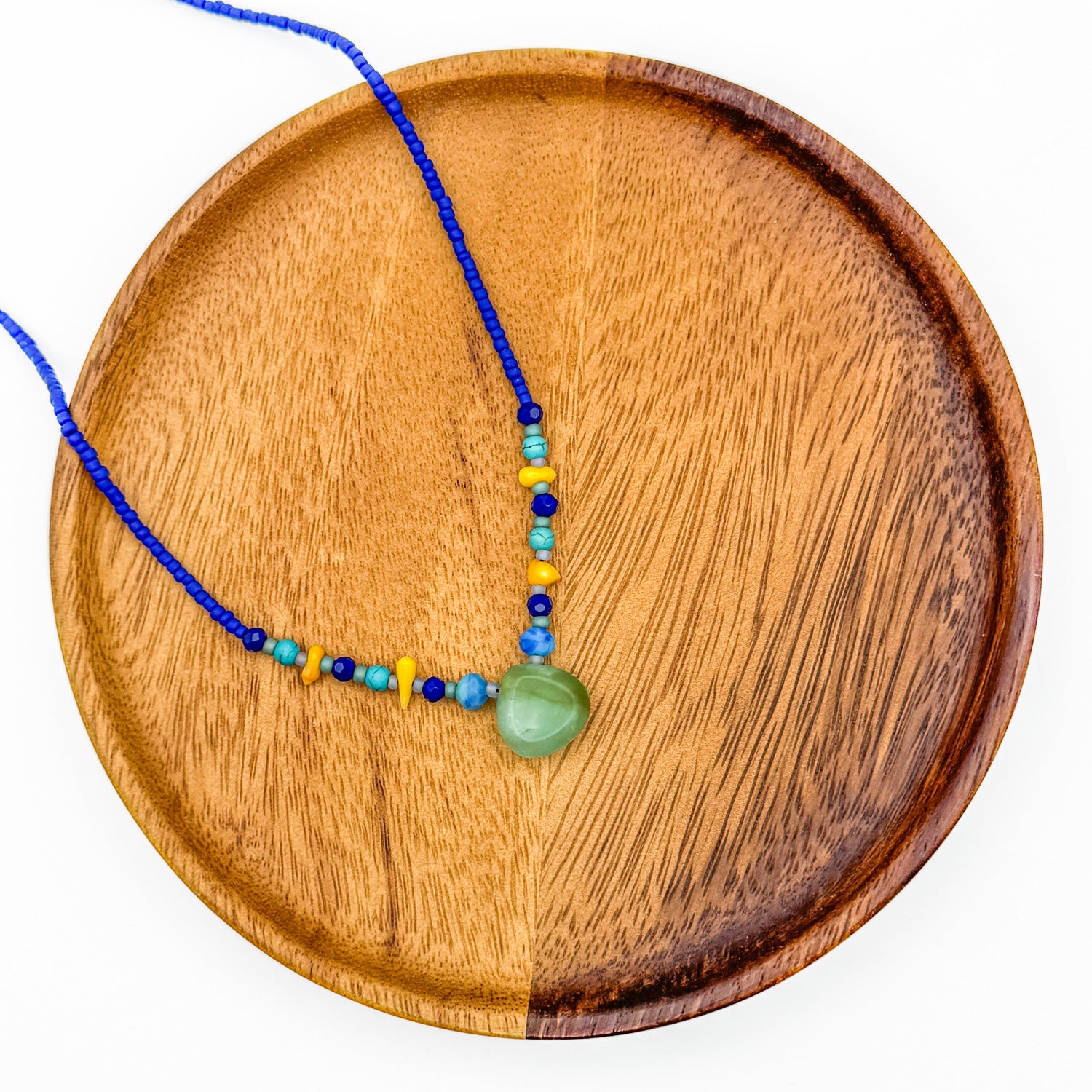 Bring color and calm to your style with this handmade beaded necklace, featuring an amazonite centerpiece—a stone often associated with clarity and soothing energy. The beadwork combines vibrant turquoise, deep royal blue, and bright yellow accents for a look that’s both bold and balanced.