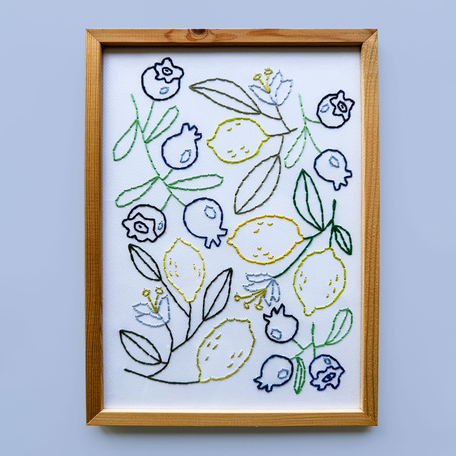 This A4 hand-embroidered artwork captures the vibrant contrast of sunlit lemons and deep, dusky blueberries—stitched with care and detail to echo the quiet beauty of a summer harvest. Each thread is placed with intention, creating a textured, effect that celebrates the artistry of needlework and the richness of natural forms.