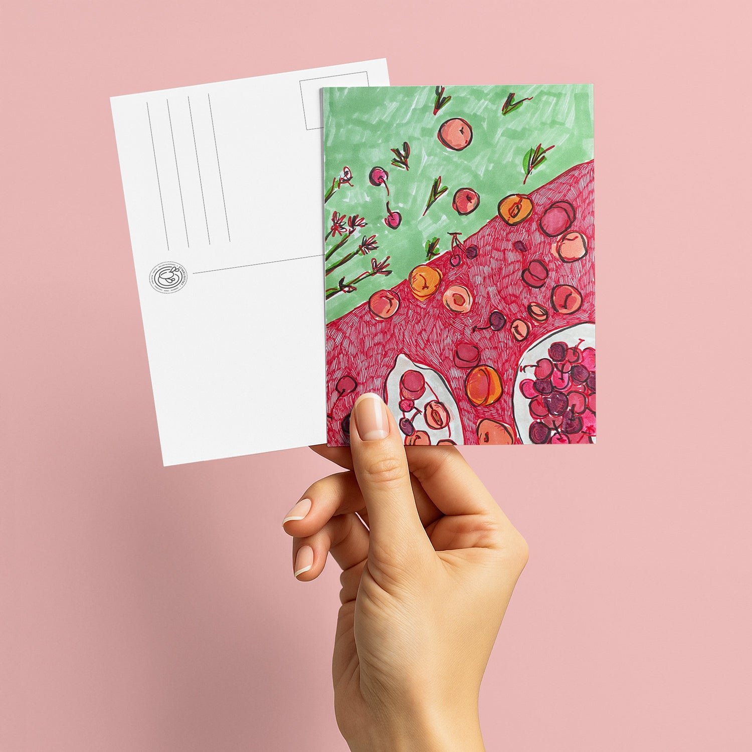 This A6 postcard showcases a beautifully detailed illustration of a sunny picnic scene, filled with juicy cherries, ripe peaches, and fresh greenery in a peaceful park setting. The vibrant, cheerful design captures the joy of lazy afternoons and sweet, simple moments, making it a perfect card to send or display as a charming decorative piece.