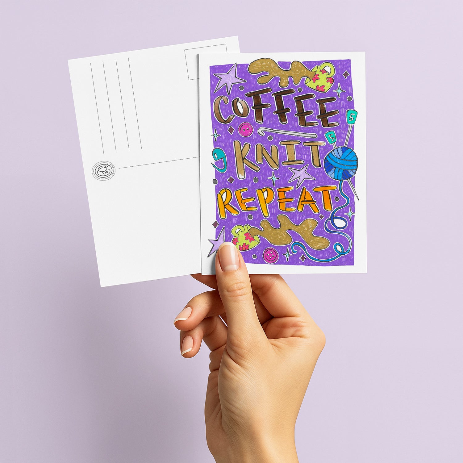 The "Coffee, Knit, Repeat" postcard is for early risers, late-night knitters, and anyone who knows that knitting + coffee = the perfect combo.