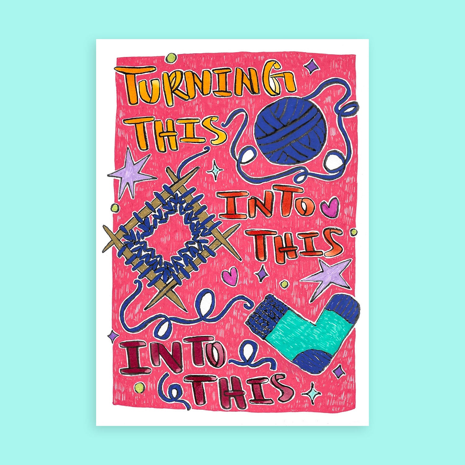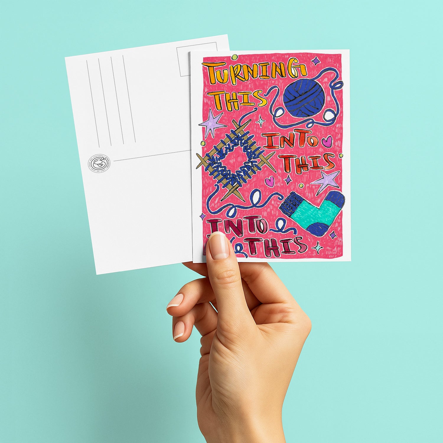 This A6 printed postcard captures the quiet magic of making—"Turning this, into this, into this"—a playful nod to the process every double-pointed needle lover knows and loves. Featuring charming illustrations of yarn transforming into socks through the elegant dance of DPNs, it’s a visual celebration of slow, skillful crafting.