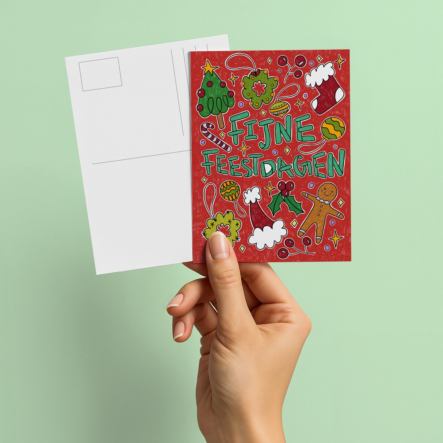 - Features festive Christmas illustrations & “Fijne Feestdagen” text