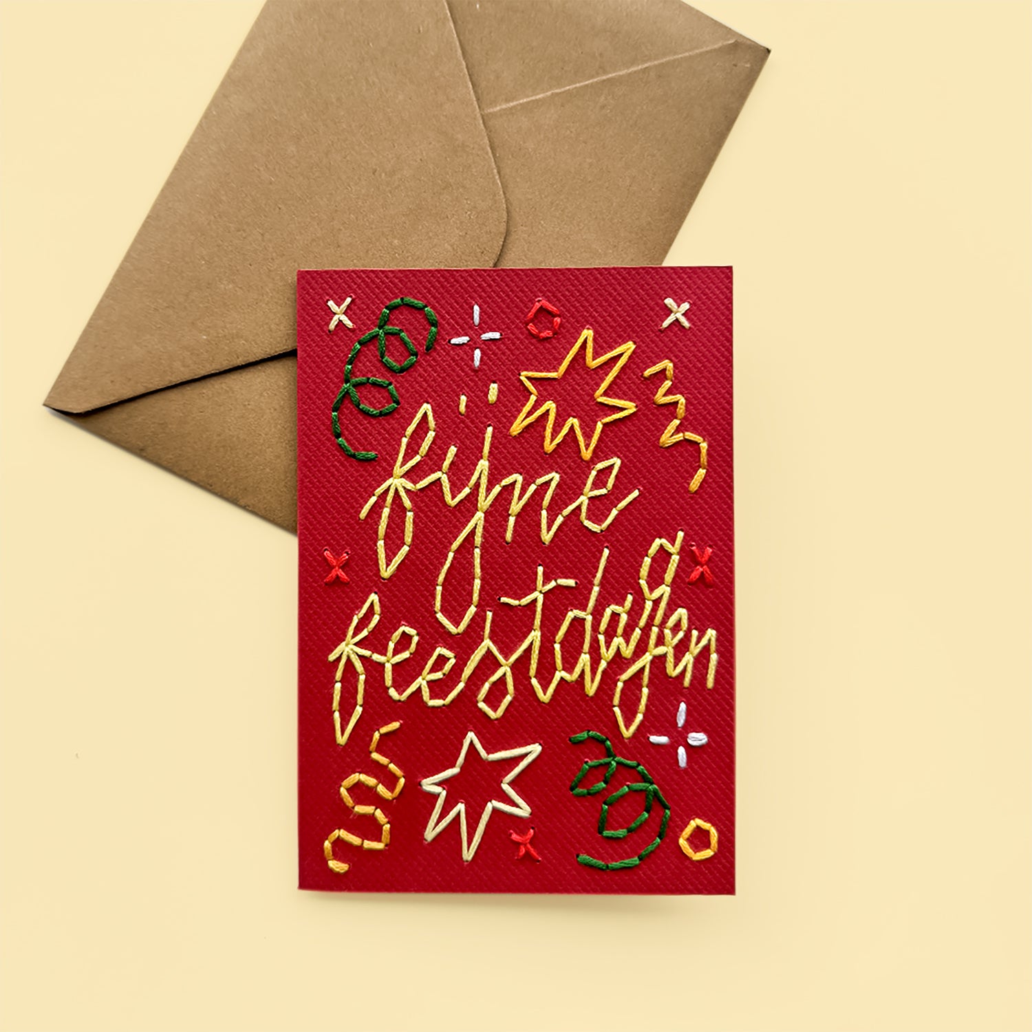 This red A6 card is folded carefully by hand and embroidered with the words “Fijne Feestdagen” — Dutch for Happy Holidays — adding a personal, textured touch that makes every card truly unique.