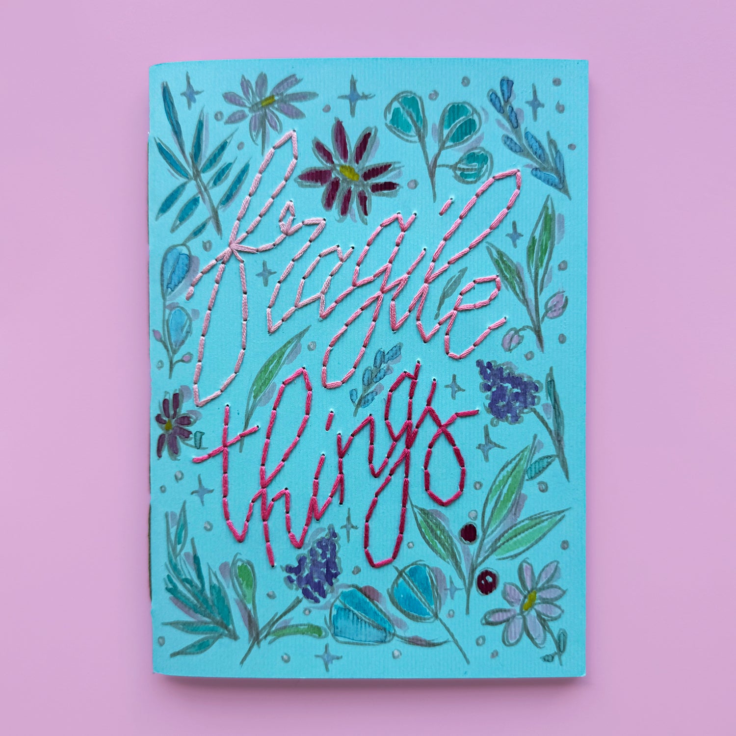 This delicately handcrafted notebook is a tribute to the beauty of softness, sensitivity, and fleeting moments. Featuring a gentle-toned paper cover with hand-stitched embroidery of the words "Fragile Things" and soft watercolor floral details, this notebook is both elegant and deeply poetic.
