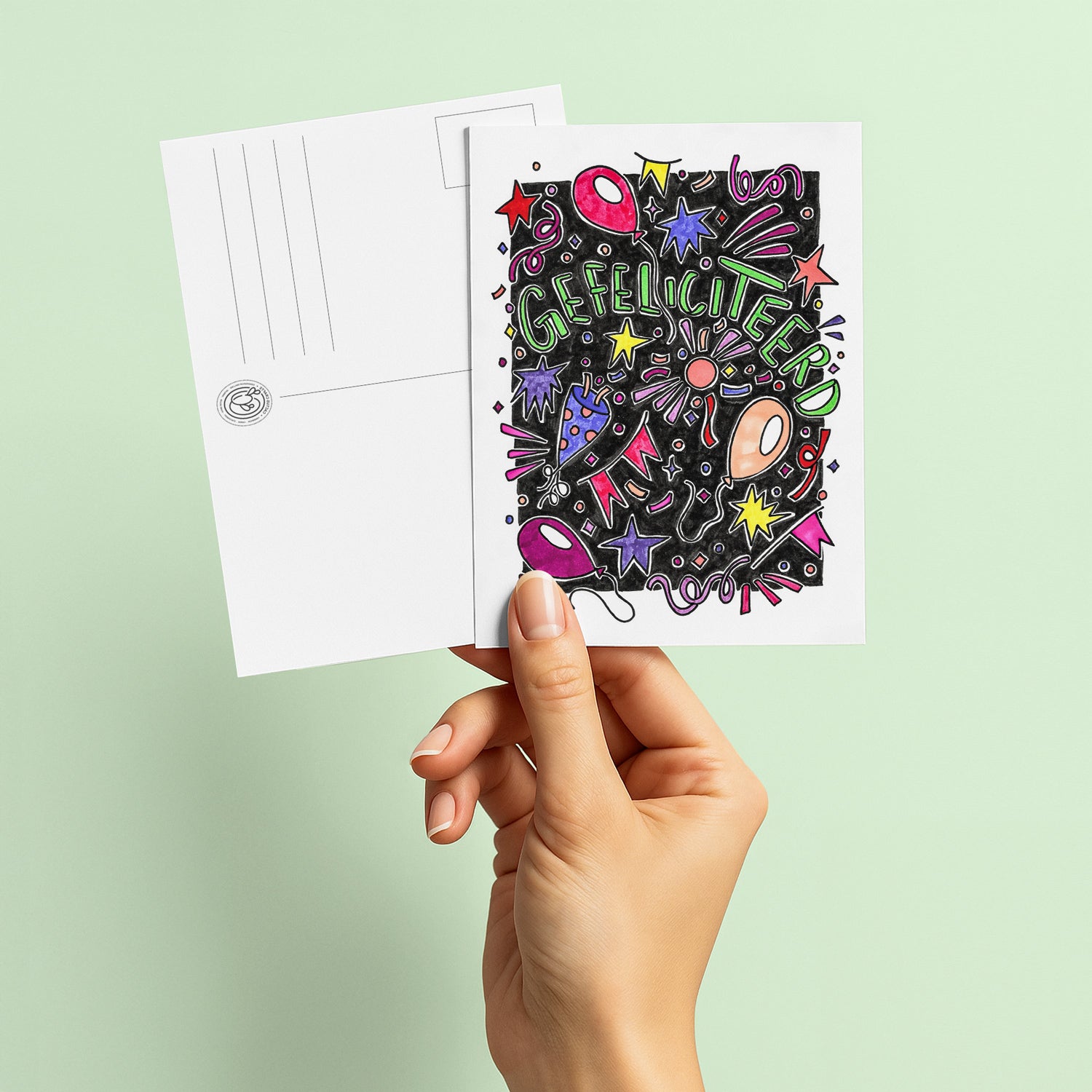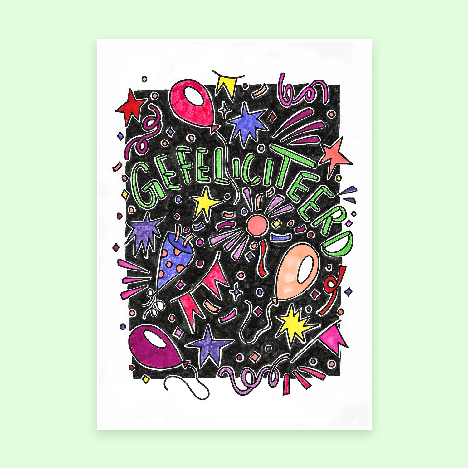 This A6 card is a bold and joyful way to say "Gefeliciteerd!" Bursting with vibrant colors and playful celebration elements—like confetti, balloons, and festive treats—set against a black background, it’s the perfect card to mark any happy occasion.