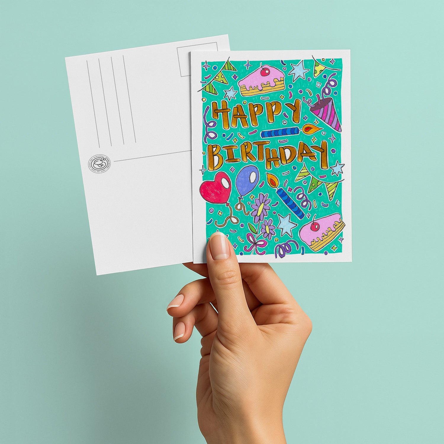This A6 printed card is a fun and cheerful way to celebrate a special day! Featuring playful illustrations of a delicious cake and colorful balloons, it showcases the joyful message "Happy Birthday," making it the perfect card to send warm wishes and brighten someone’s celebration.