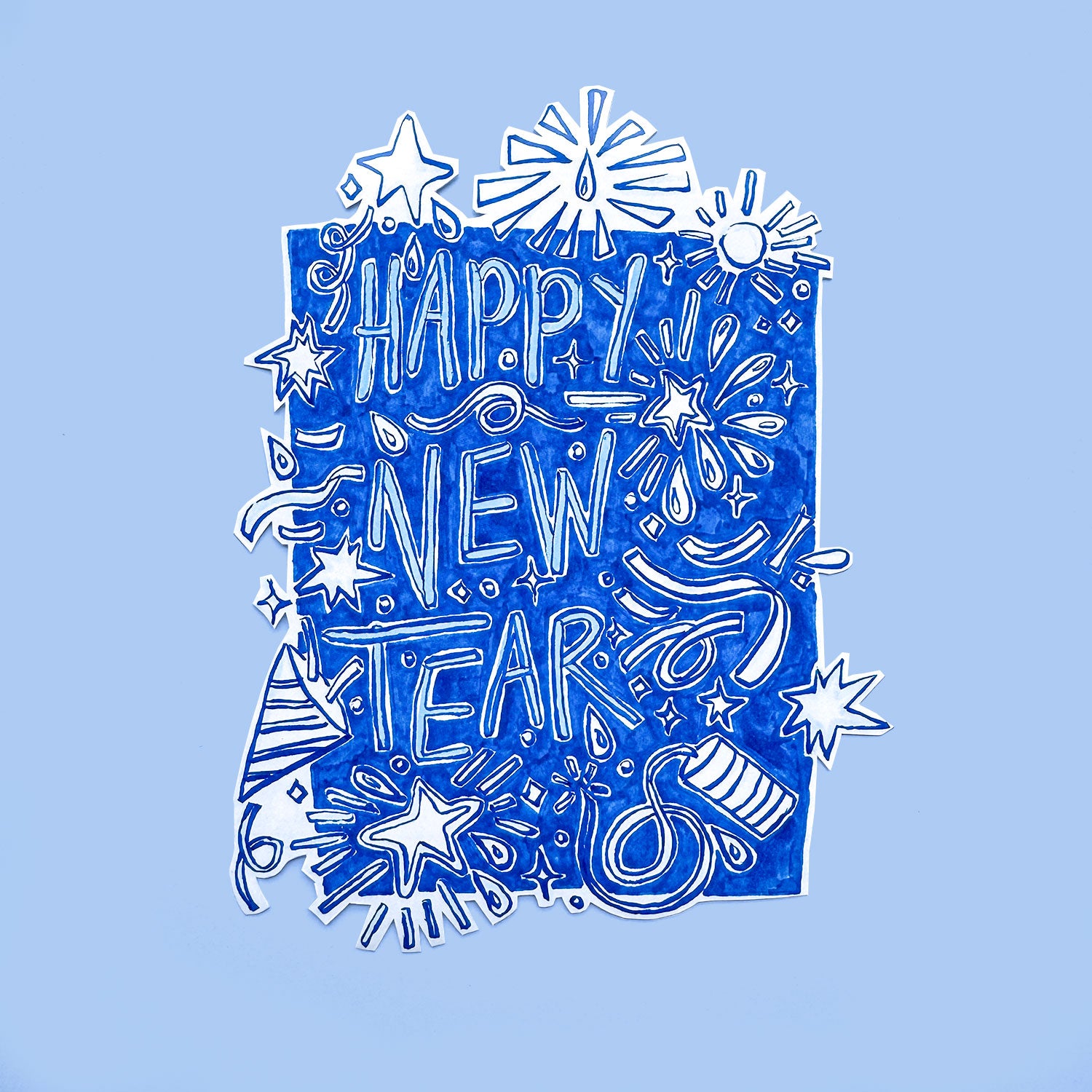 This large sticker puts a tender twist on celebration with the phrase: “Happy New Tear”—a cheeky, heartfelt nod to fresh starts, messy emotions, and the beauty of feeling it all. Surrounded by hand-drawn festive blue illustrations, it’s equal parts playful and poetic.