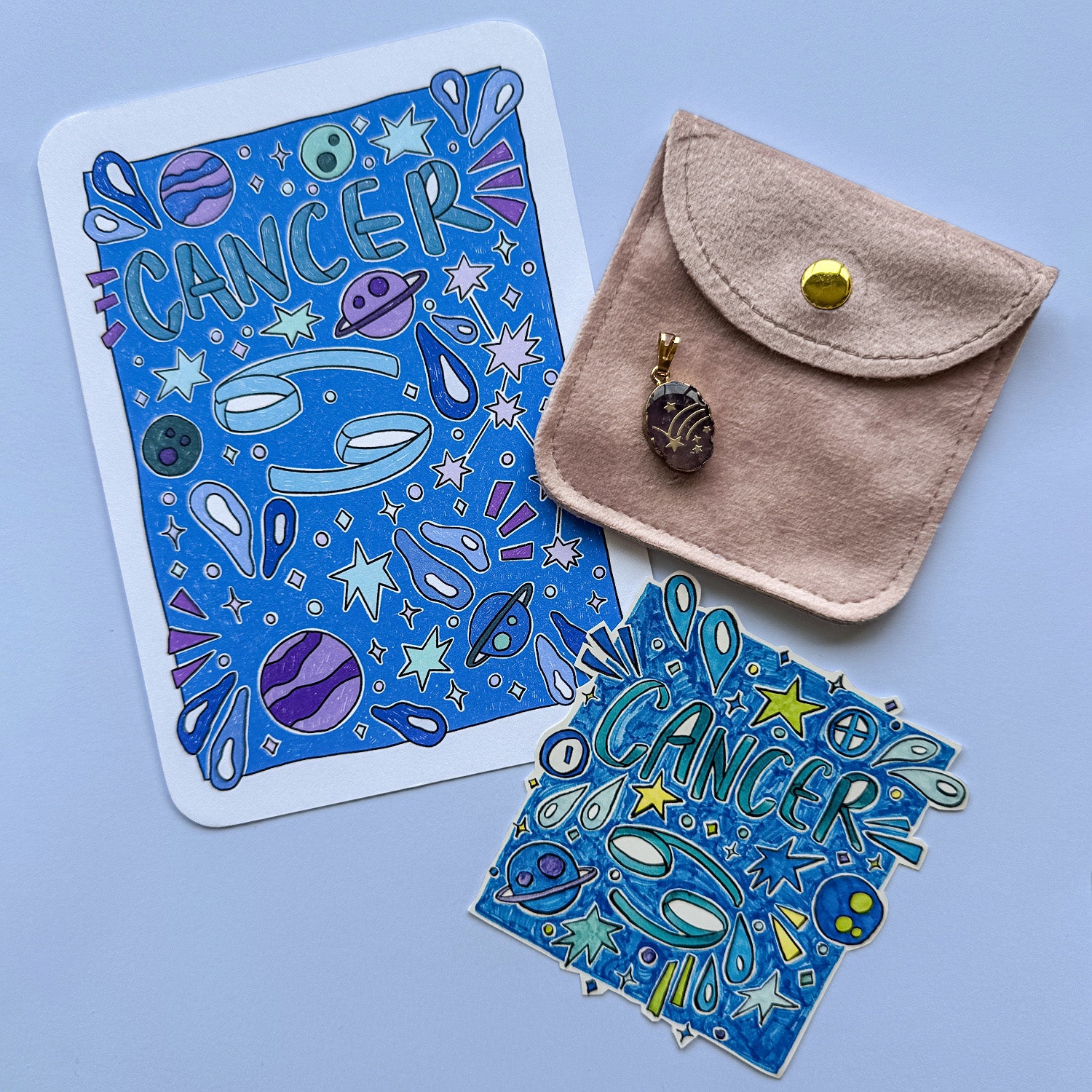 ♋ Cancer Horoscope Gift Set — Postcard, Sticker & Amethyst Pendant