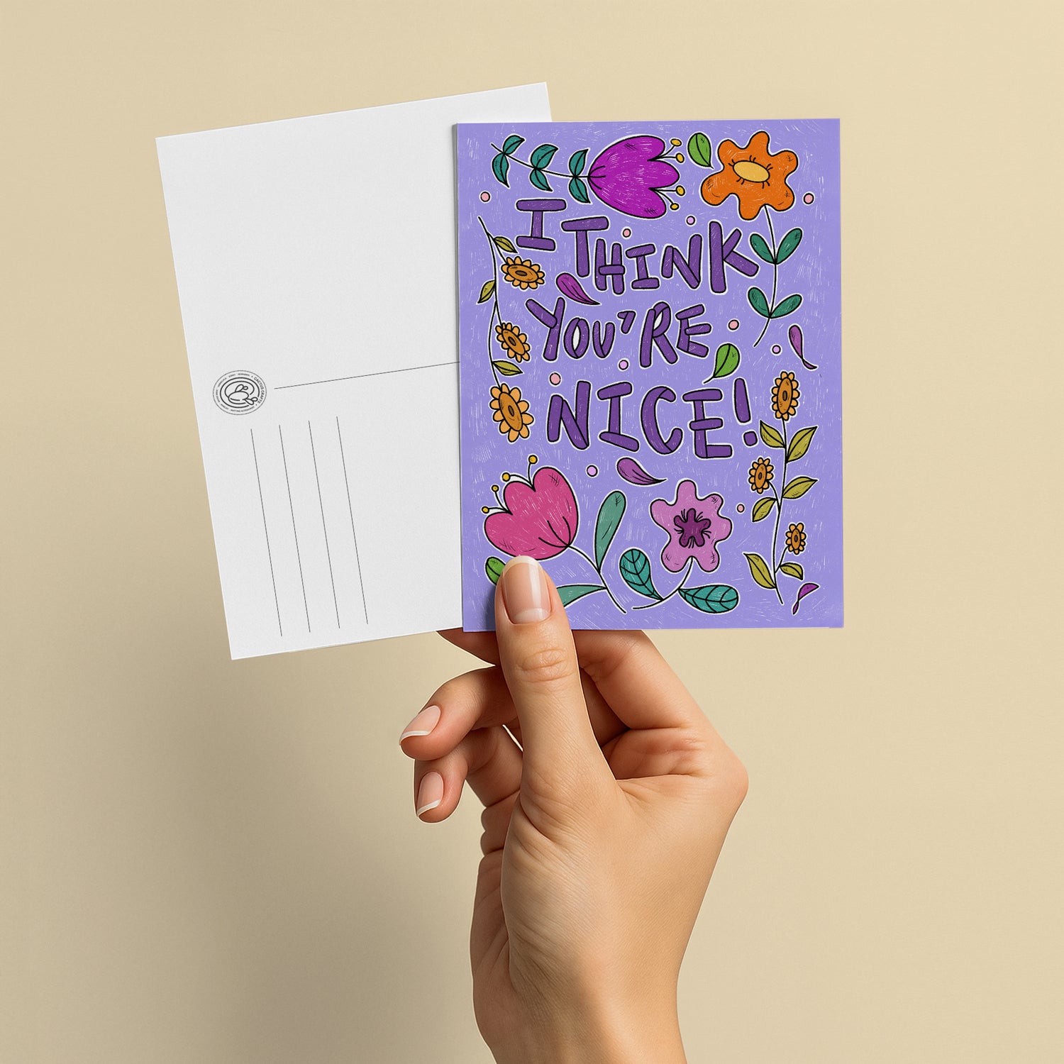 This A6 printed card features gentle floral illustrations and the cheerful message “I think you’re nice” — a simple, heartfelt way to share kindness, admiration, or appreciation. Whether for a friend, partner, or someone who deserves a smile, it’s a lovely way to say you care.
