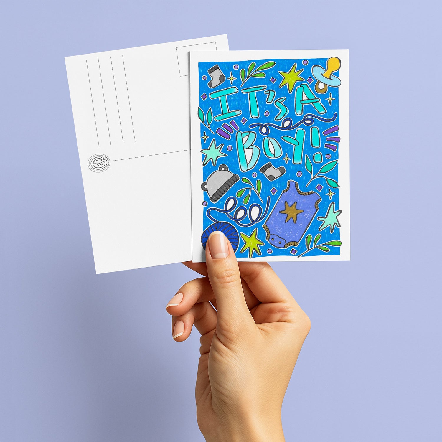Welcome a little bundle of joy with this charming A6 card featuring the cheerful message "It's a Boy!" Surrounded by soft, playful illustrations—think cozy knits, tiny booties, and baby essentials—it’s the perfect way to celebrate a new arrival.
