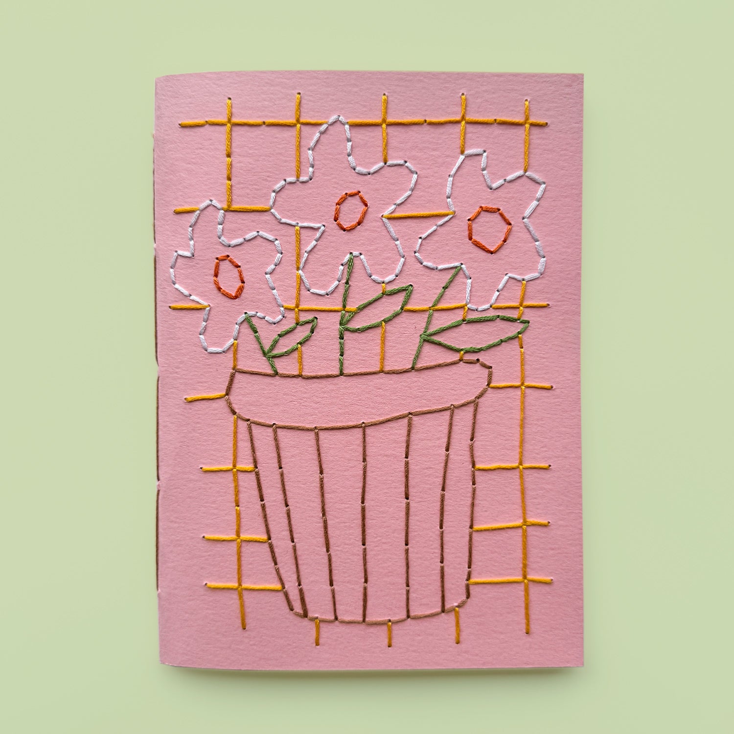 this handcrafted A5 notebook features house flowers in a pot delicately embroidered across the cover, each flower hand-stitched in white against a gingham background. With 20 blank pages of 160gsm paper and a carefully handcrafted binding.
