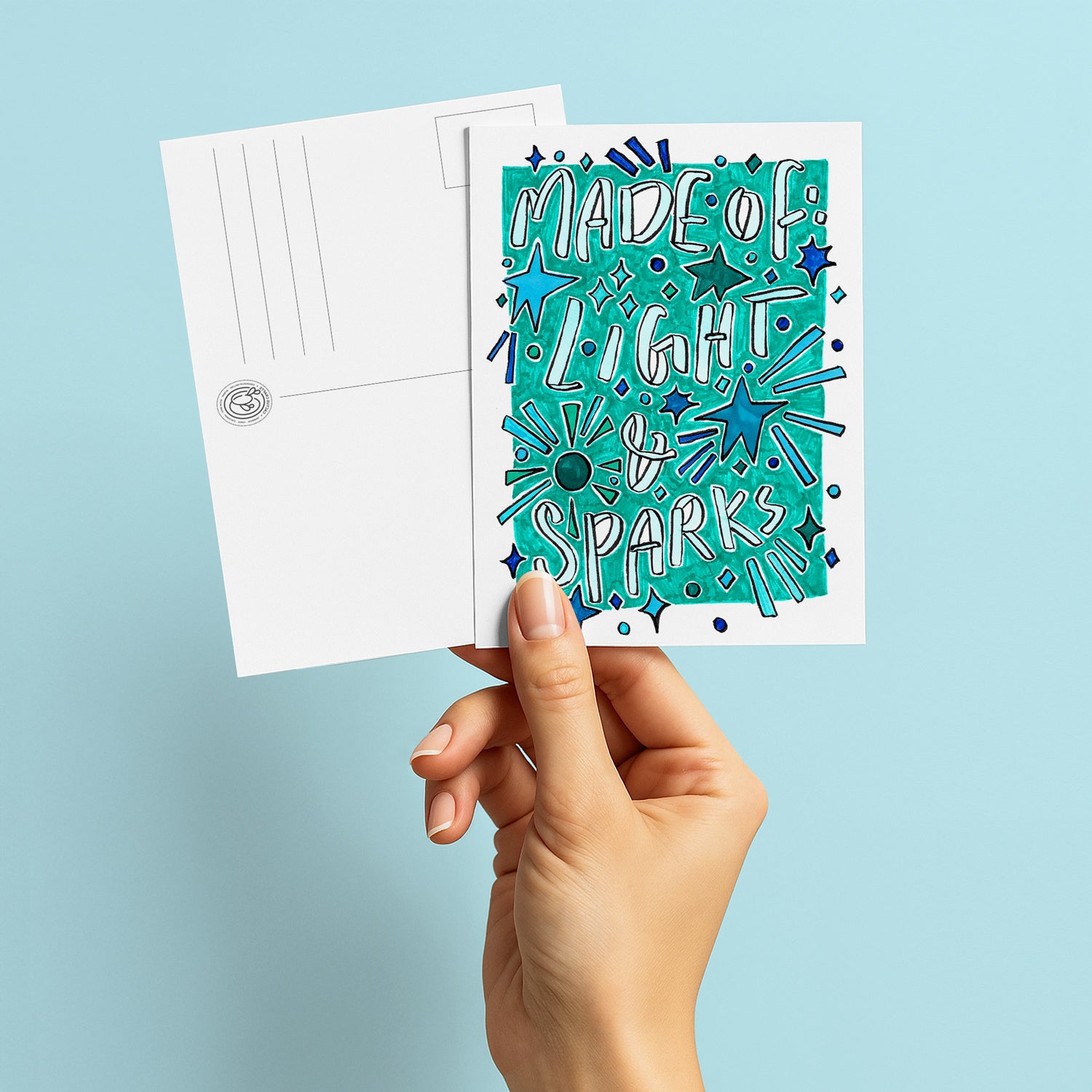 Infuse a little magic into someone's day with this vibrant A6 printed postcard! Featuring a dazzling design with radiant light and spark illustrations, it showcases the inspiring quote "Made of Light and Sparks," capturing the energy and excitement of creativity and joy.