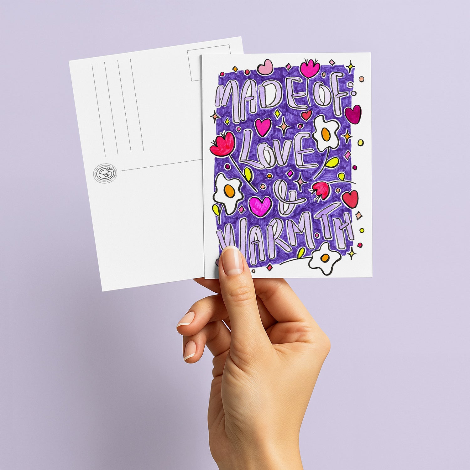 Share a little warmth and affection with this heartwarming A6 printed postcard! Featuring a beautiful design with delicate flowers and sweet heart illustrations, it showcases the loving quote "Made of Love and Warmth," spreading comfort and kindness.