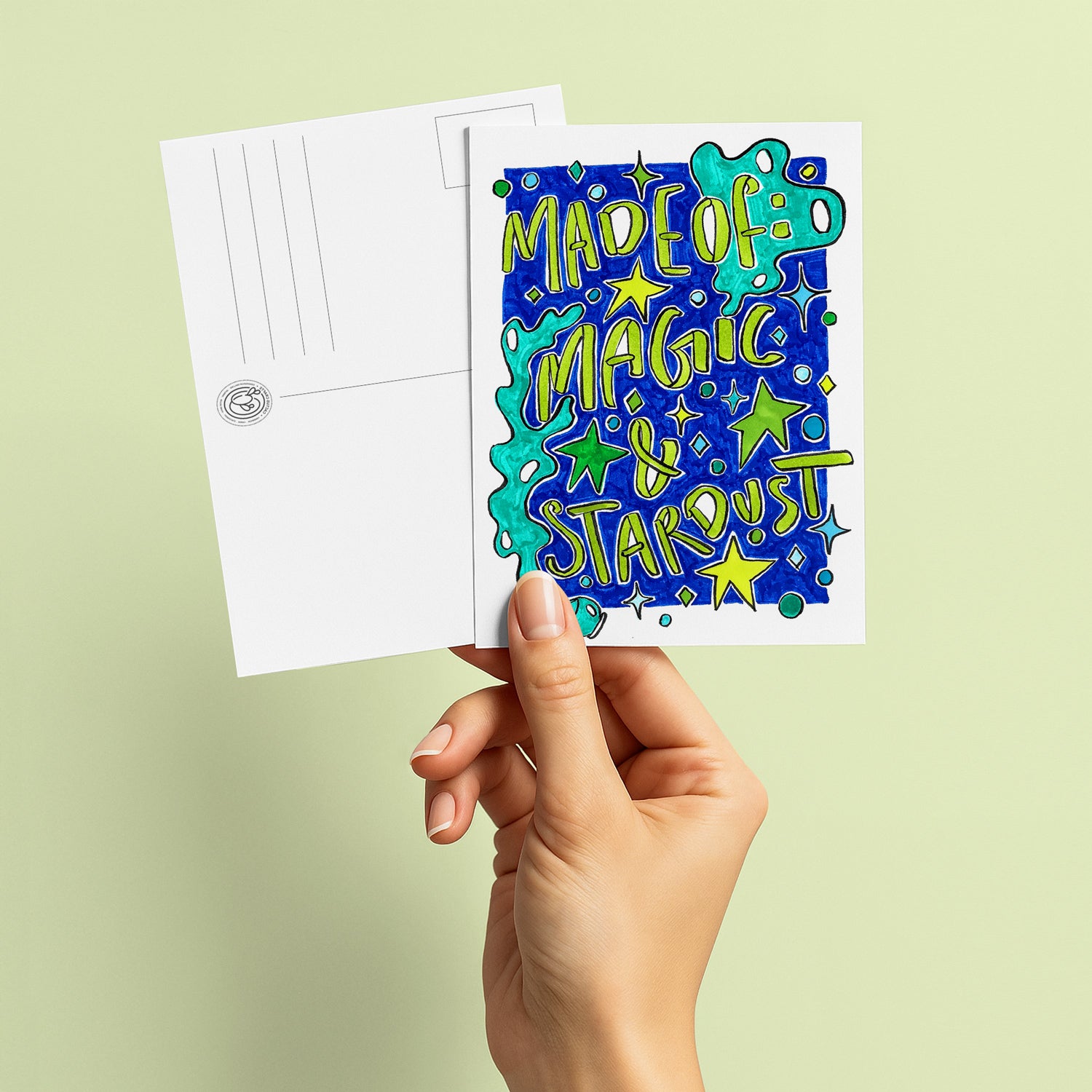 The "Made of Magic and Stardust" postcard is part of the What Are You Made Of? collection.