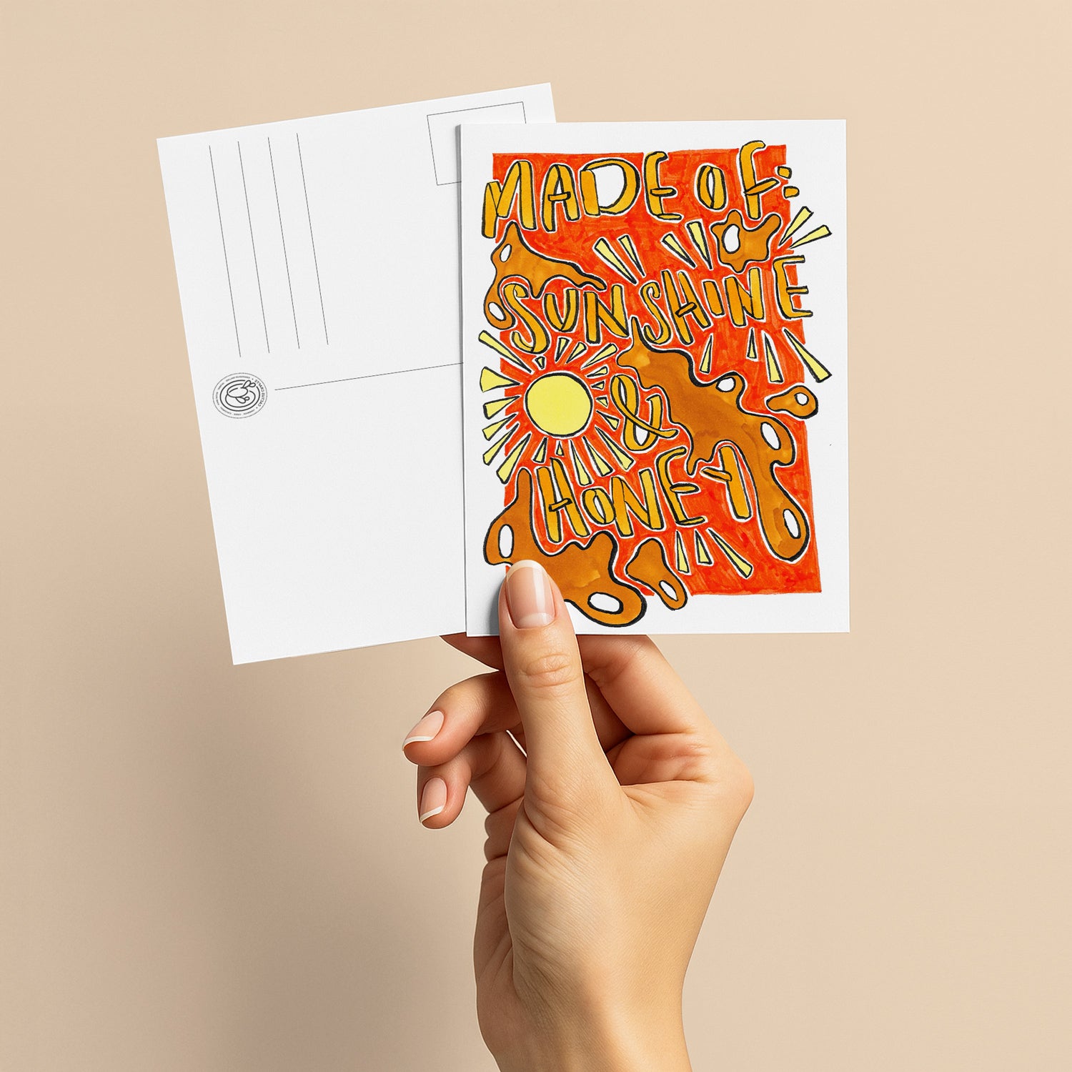 Brighten someone’s day with this charming A6 printed postcard, featuring a warm and inviting design. With illustrations of the sun and drops of honey in rich orange hues, it showcases the uplifting quote "Made of Sunshine and Honey," radiating warmth and positivity.