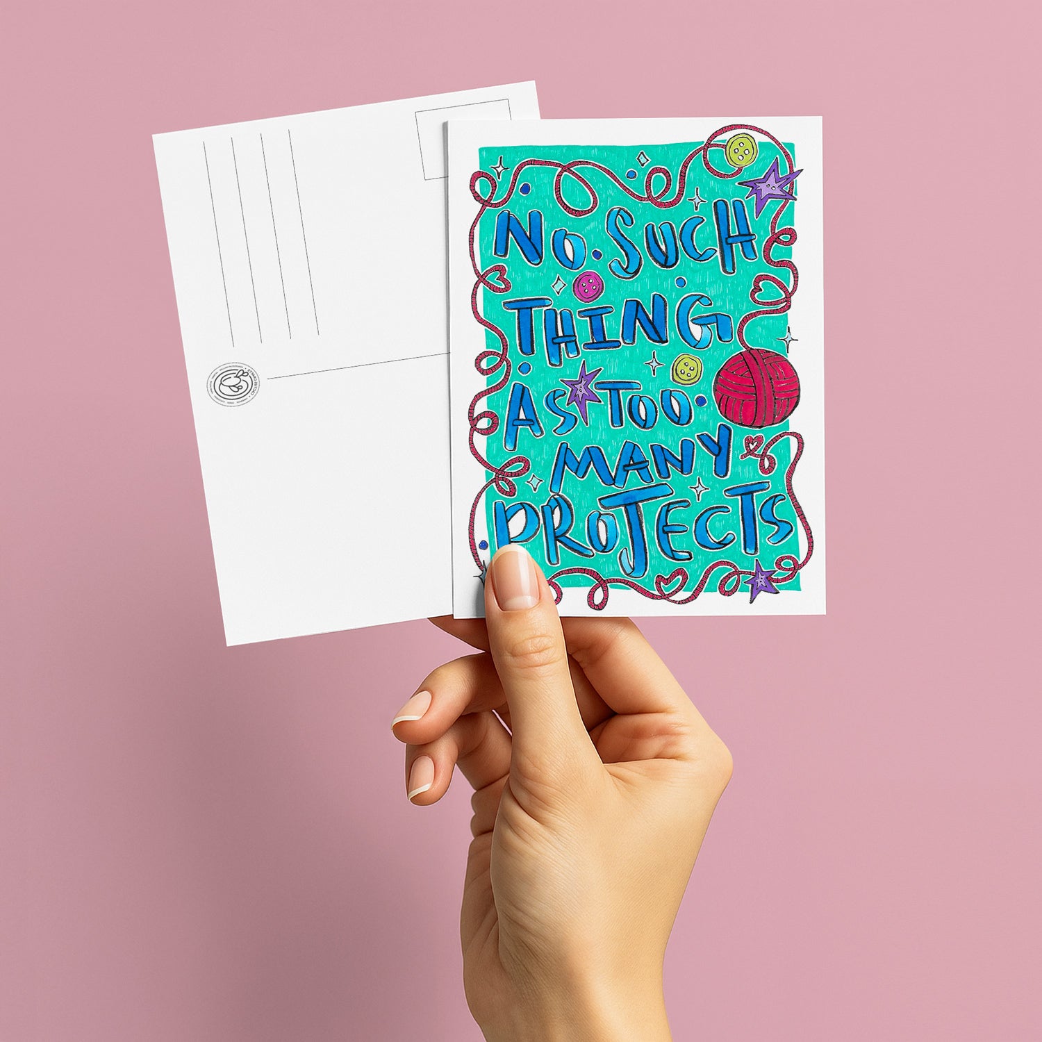 The "No Such Thing as Too Many Projects" postcard is made for knitters who believe more yarn means more joy. 🧶