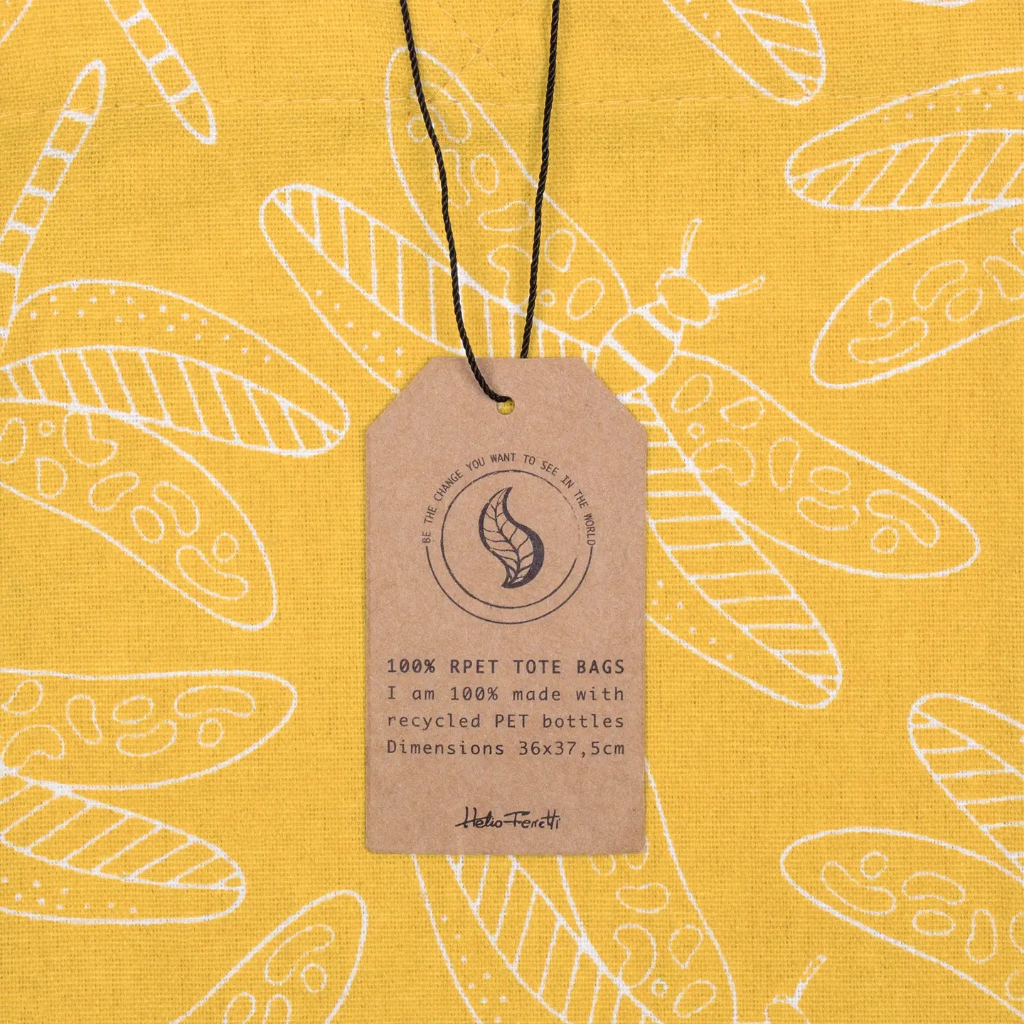 Step into sustainability with Helio Ferretti's RPET tote bag, made entirely from 100% recycled PET bottles. This yellow tote with a whimsical dragonfly print is not only eye-catching but also environmentally conscious—each bag gives new life to nearly 3 recycled plastic bottles.