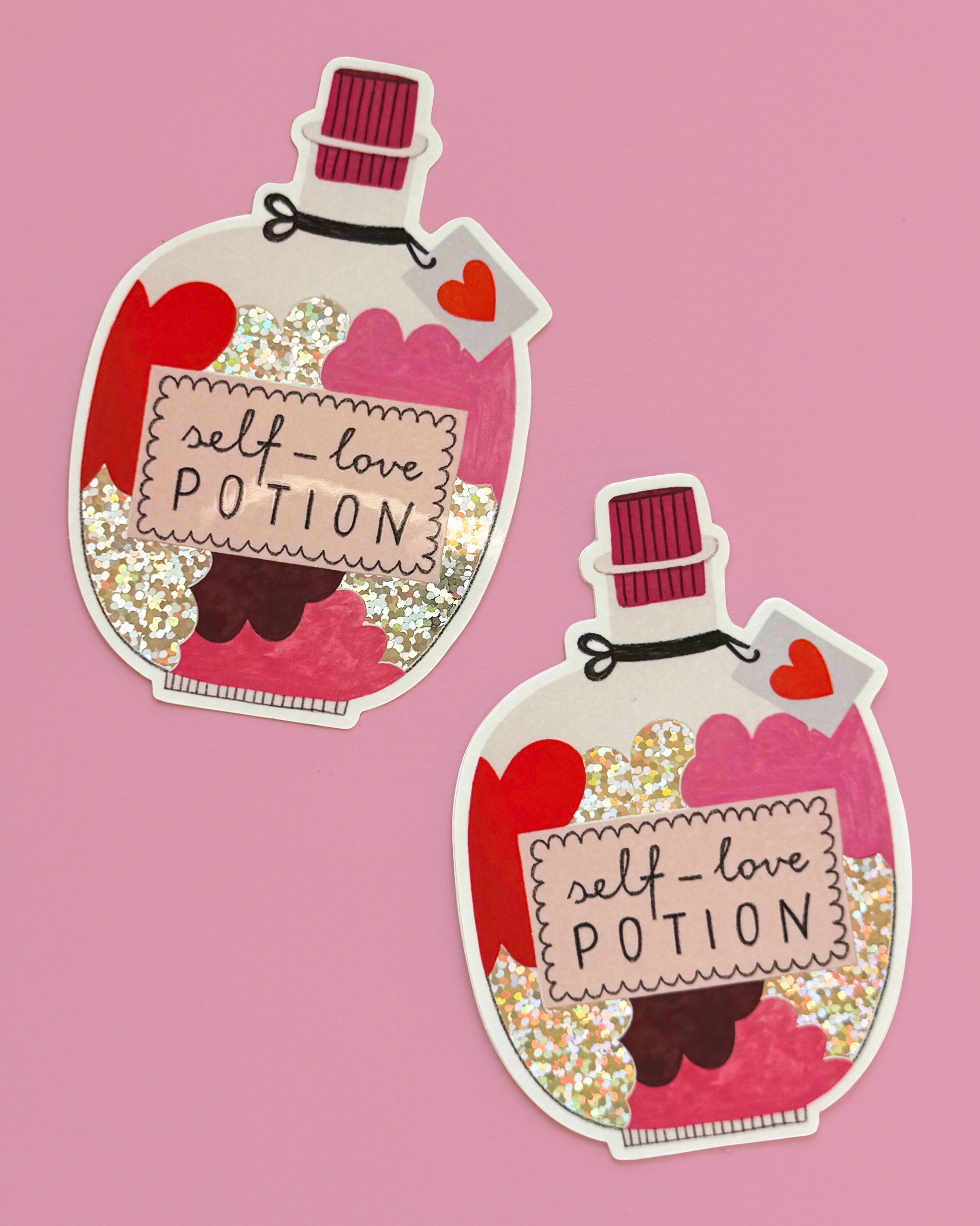 This enchanting Self-Love Potion glitter sticker is a sparkling reminder to pour kindness back into yourself. Featuring a whimsical illustrated potion bottle, hand-drawn in the signature style of Daria Solak Illustrations, the design blends soft colour, shimmer, and charm into one feel-good piece.