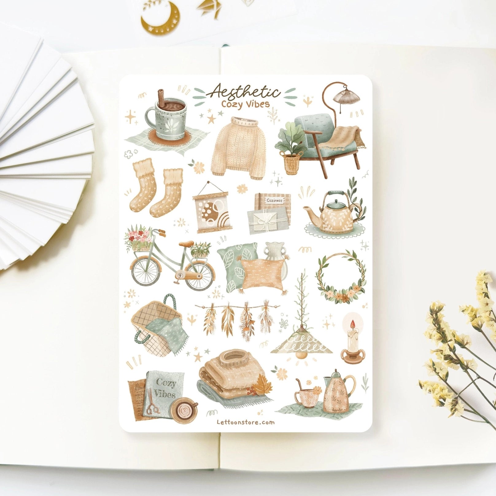 Wrap yourself in warmth with this cozy autumn aesthetic sticker sheet—perfect for bringing seasonal charm to your bullet journal, planner, or favorite notebook. Embrace the magic of fall and winter with beautifully illustrated elements like a wool sweater, snug armchair, hot chocolate with cinnamon, a cozy bicycle, and more.