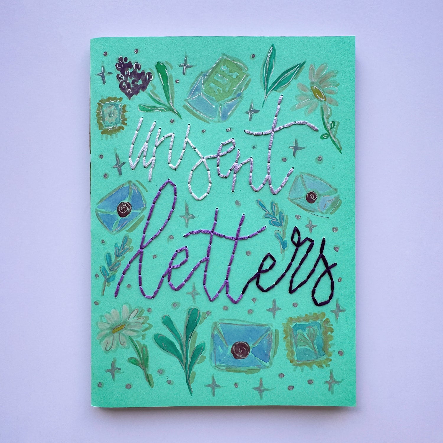 This beautifully handcrafted notebook is perfect for heartfelt reflections, unspoken words, and quiet musings. Featuring a soft paper cover with hand-stitched embroidery of the words "Unsent Letters" and delicate watercolor illustrations of pastel-colored envelopes and letters, this notebook captures the beauty of thoughts left unwritten or waiting to be shared.